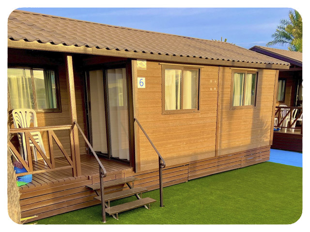 Es una casa de madera muy espaciosa, agradable y comfortable con capacidad para 6/7 personas. Está compuesta de un salón comedor con sofá cama (2 plazas), dos habitaciones dobles (ambas con dos camas separadas) y una habitación doble con cama de matrimonio en la buhardilla. Dispone de cuarto de baño con WC, lavabo, ducha con agua caliente, cocina equipada con menaje, fregadero, encimera, frigorífico y microondas. Tiene un porche con terraza cubierta y mobiliario incluido.